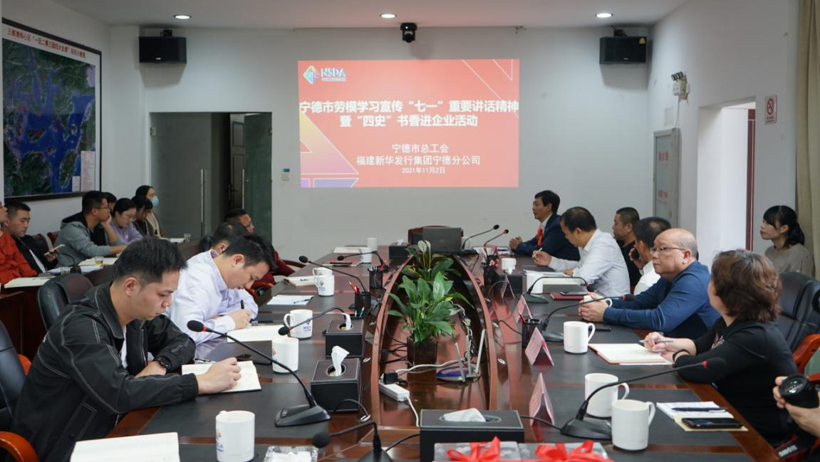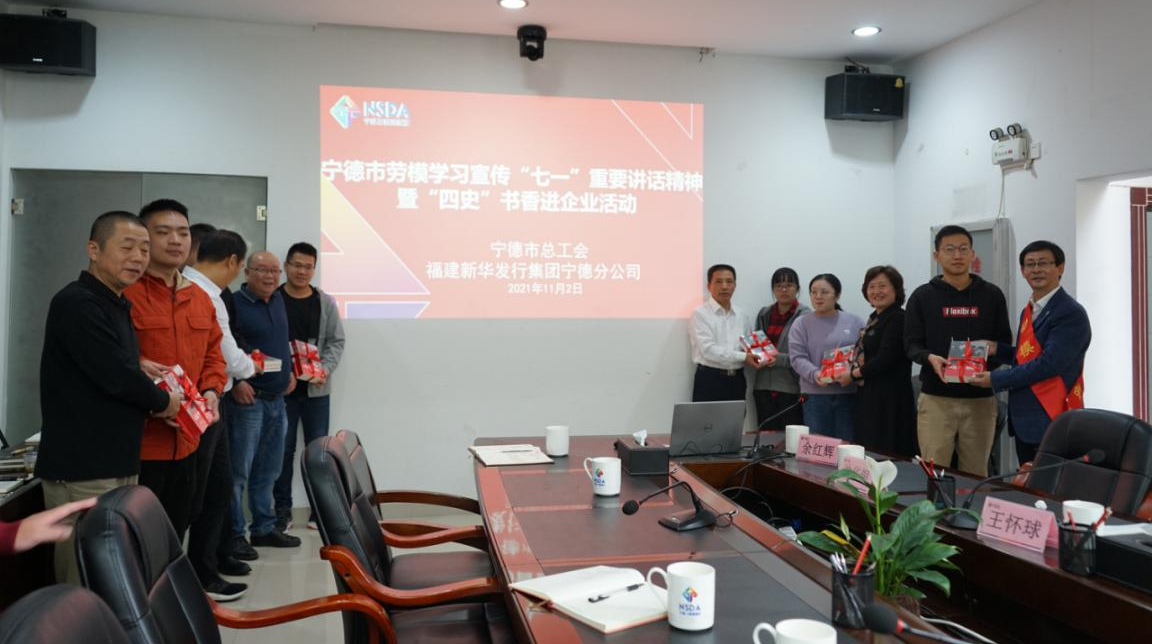 11月2日,市總工會(huì)黨組成員、三級(jí)調(diào)研賴文宮同志,勞模代表、2019年福建省五一勞動(dòng)獎(jiǎng)?wù)?、古田縣委黨校高級(jí)講師余紅輝同志,福建新華發(fā)行集團(tuán)寧德分公司副總經(jīng)理繆友文一行到我公司開展勞模學(xué)習(xí)宣傳“七一”重要講話精神暨“四史”書香進(jìn)企業(yè)活動(dòng)。公司黨委委員、工會(huì)主席王懷球主持會(huì)議,公司本部及子公司干部職工參加宣講會(huì)。